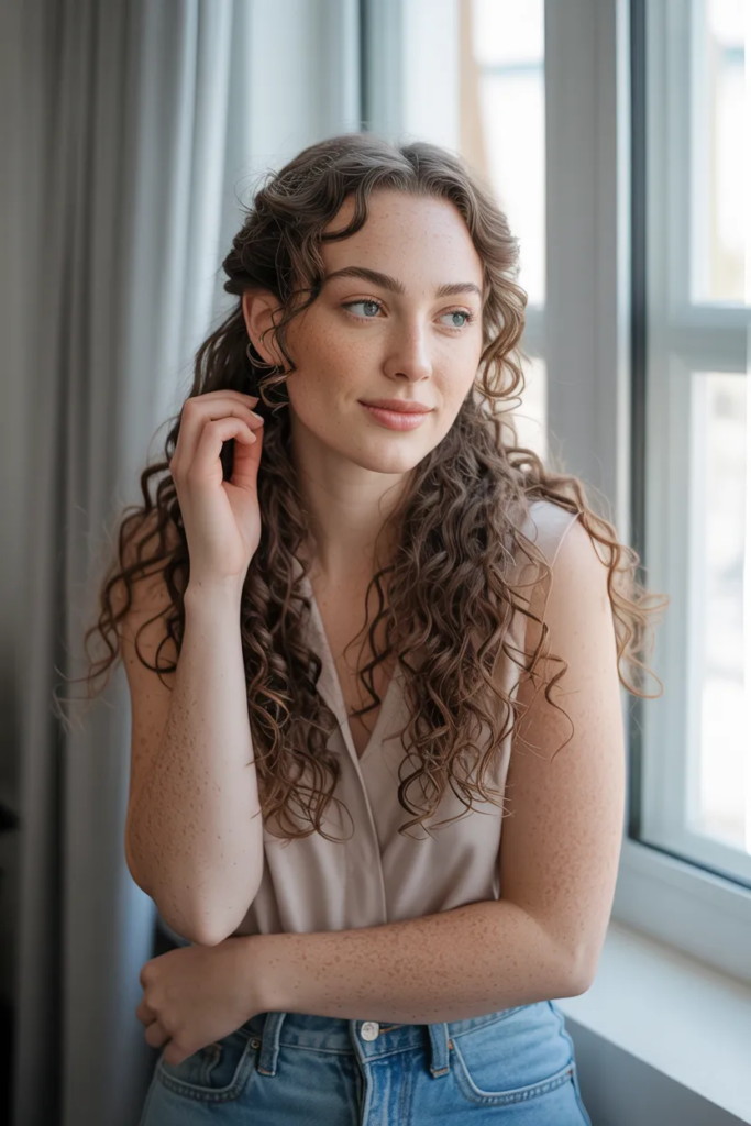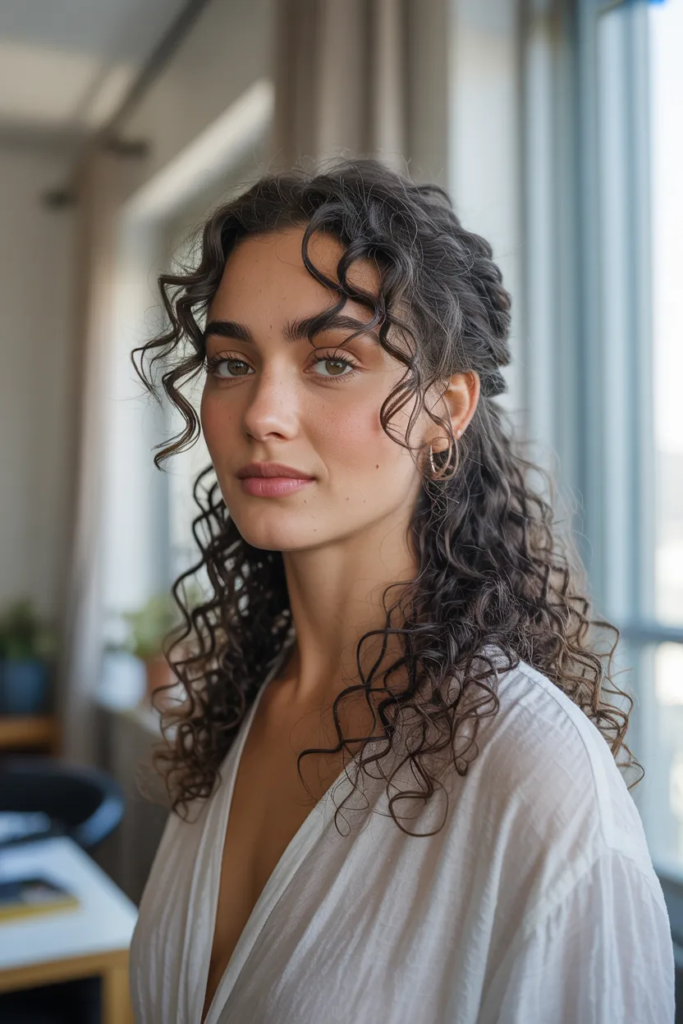 This timeless style is a favorite for a reason. It keeps your curls flowing freely while pulling just enough hair back to frame your face beautifully. The contrast between structure and softness creates a look that feels both effortless and polished.
