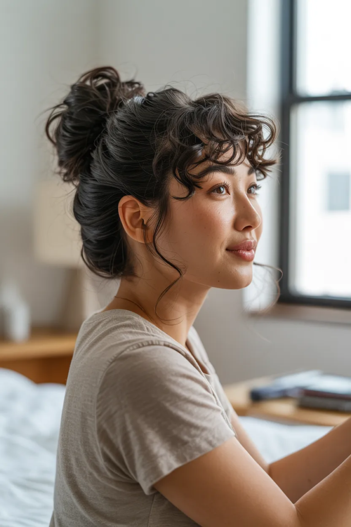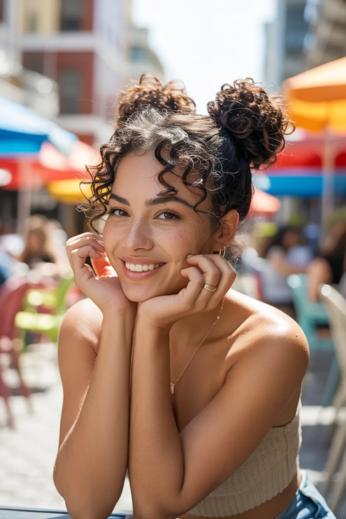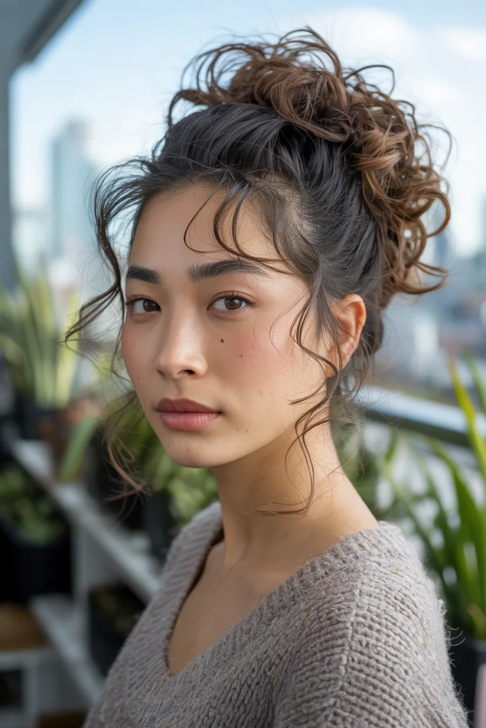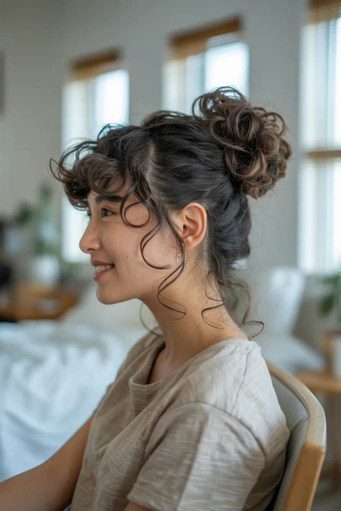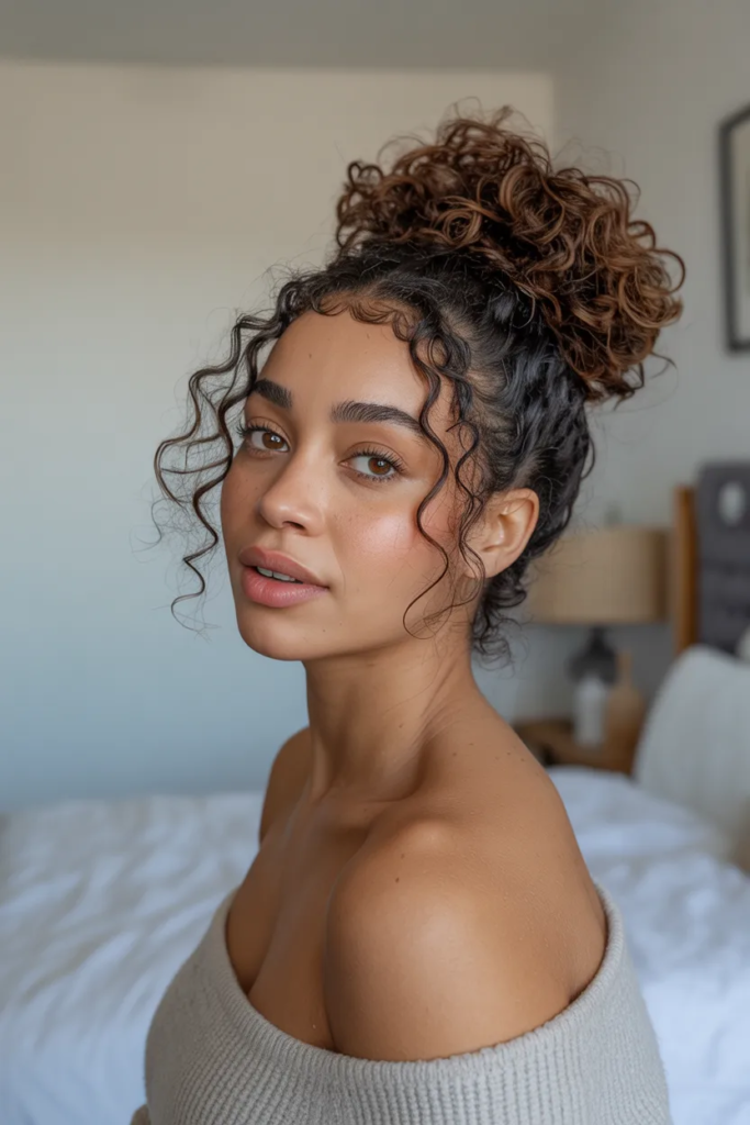 A high bun with natural curls brings instant drama in the best way. The volume from your curls creates a full, textured bun that looks luxurious without needing too much styling.