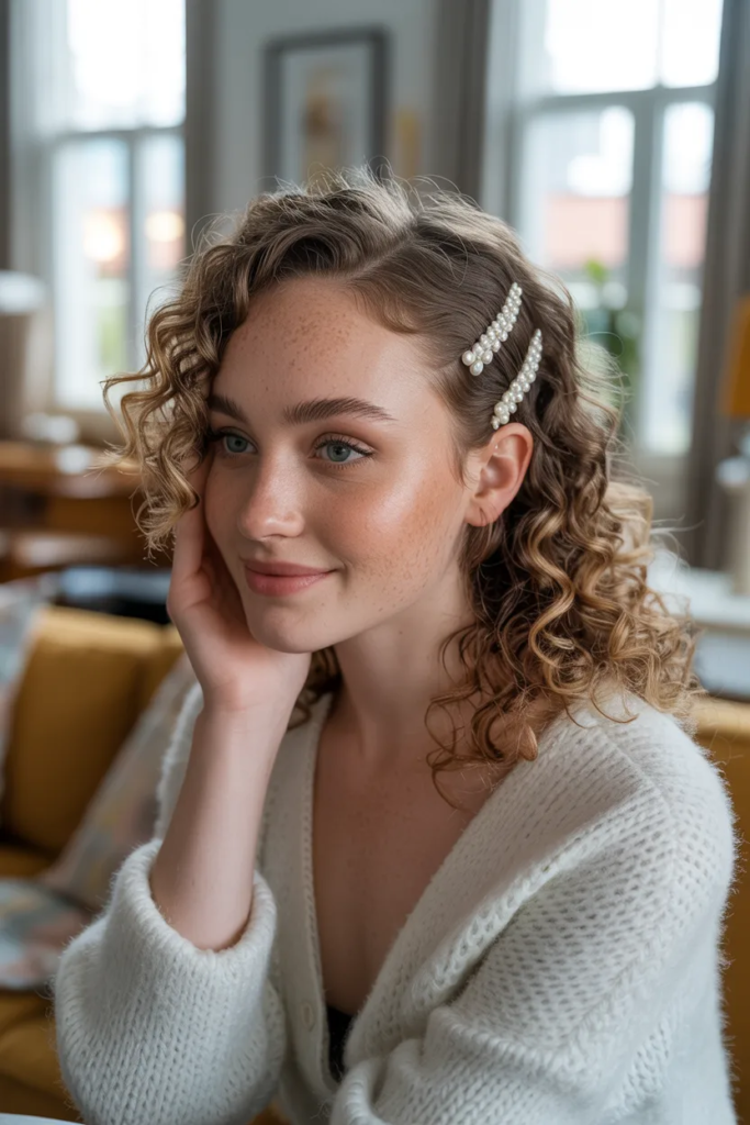 Hair accessories can completely transform a hairstyle, especially when paired with naturally voluminous curls. Adding clips, pearls, or delicate pins to a half-up curly style instantly makes it feel more formal and styled for a special occasion.