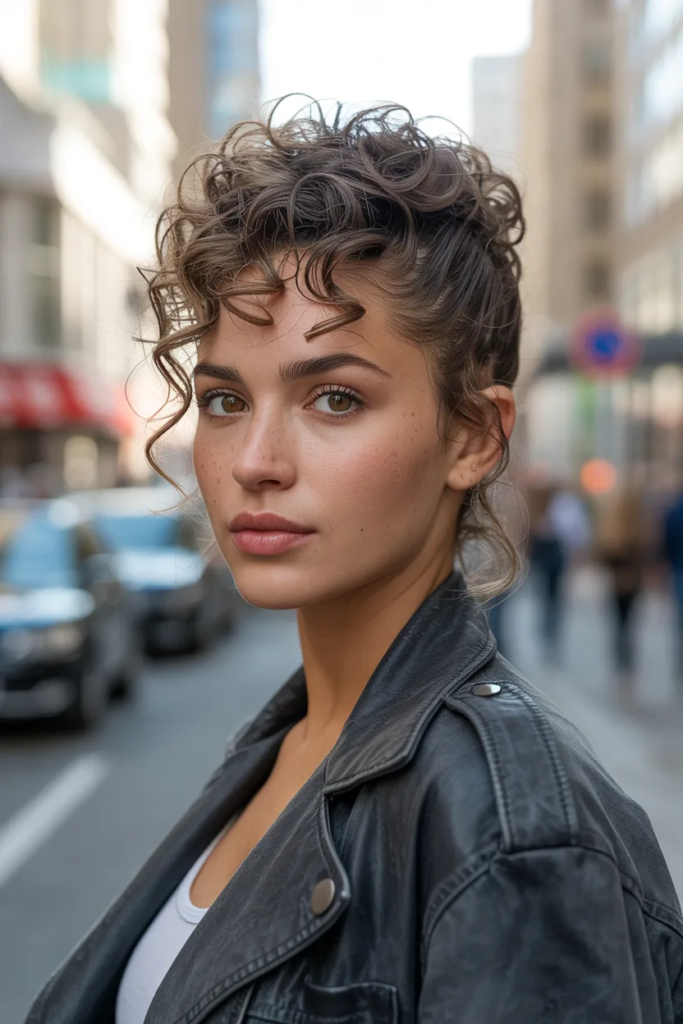 For something truly standout and fashion-forward, a curly faux hawk is a bold and creative choice. By pinning sections upward, you create height, volume, and dramatic shape.