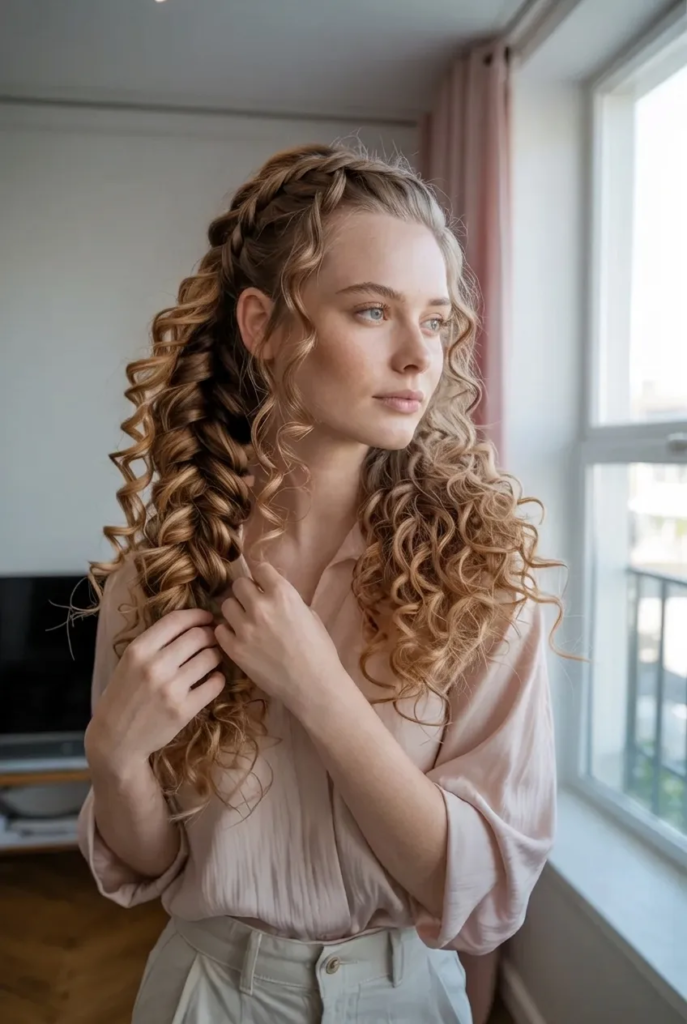 This style looks especially beautiful with medium to long curly hair and adds a unique twist to classic braided looks. It’s ideal if you want a hairstyle that feels detailed without being overwhelming.