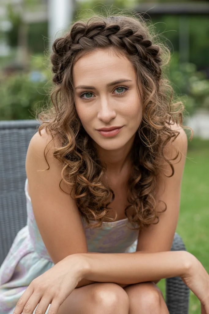 A crown braid combined with curls gives off major princess energy. The braid wraps around your head like a halo, while your curls add softness and volume underneath.