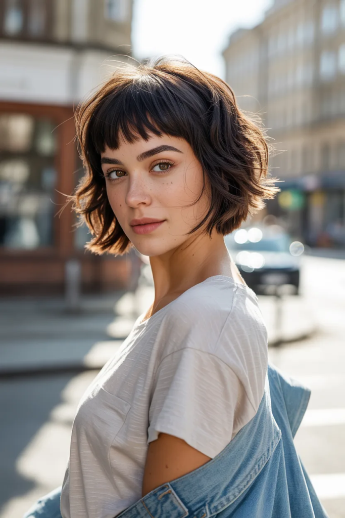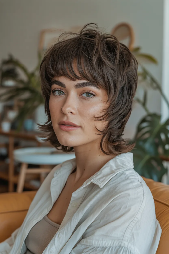 Wispy bangs bring a soft, airy touch to the short wolf cut, balancing out the heavier layers. They create a light, delicate finish that feels fresh and modern.